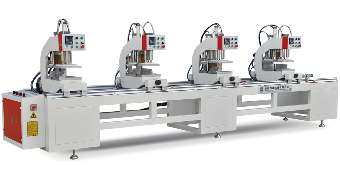 Four-head Welding Machine is a special machine for processing uPVC doors and windows. The machine guarantees the welding strength, welding accuracy and durability of uPVC windows and doors through PLC programmer control, pneumatic driving system, and high-accuracy liner bearing motional pairs. The movements of profile clamping, profile melting, and frame fabricating are controlled by a PLC, and all the movements are finished one by one automatically, easy to operate. Additionally, good-performance and long-life pneumatic components, industrial PLC in control system, and high-strength machine construction, guarantee the service life of the uPVC window welding machine. The machine is one of essential uPVC window manufacturing machines.